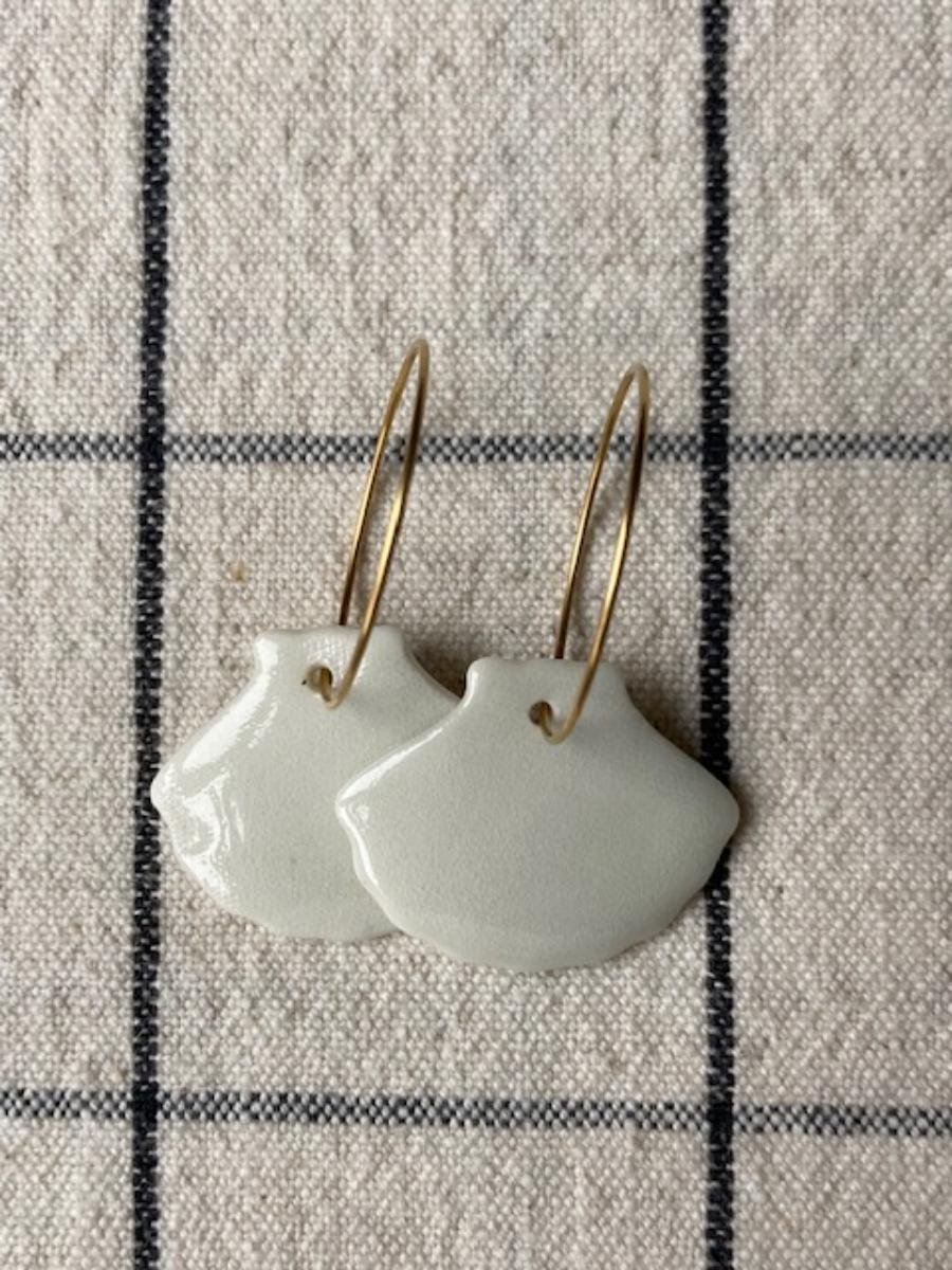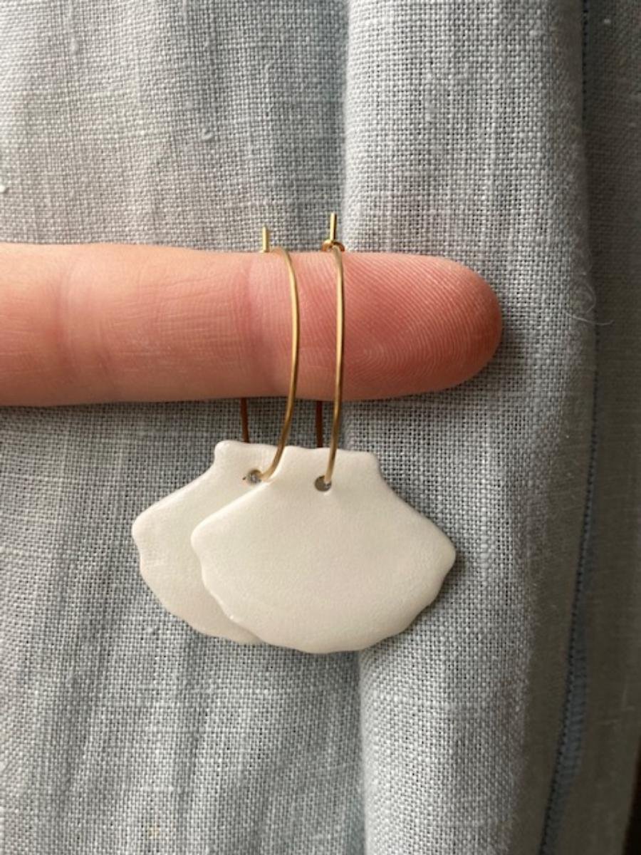 Boucles d’oreilles pastilles réalisées avec de la porcelaine de Limoges et associées à des anneaux type créoles en acier inoxydable doré. Recouvertes d’un émail transparent sur la face avant. Laissées en porcelaine brut sur la face arrière.