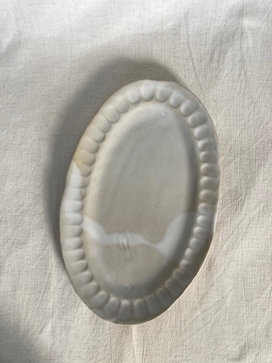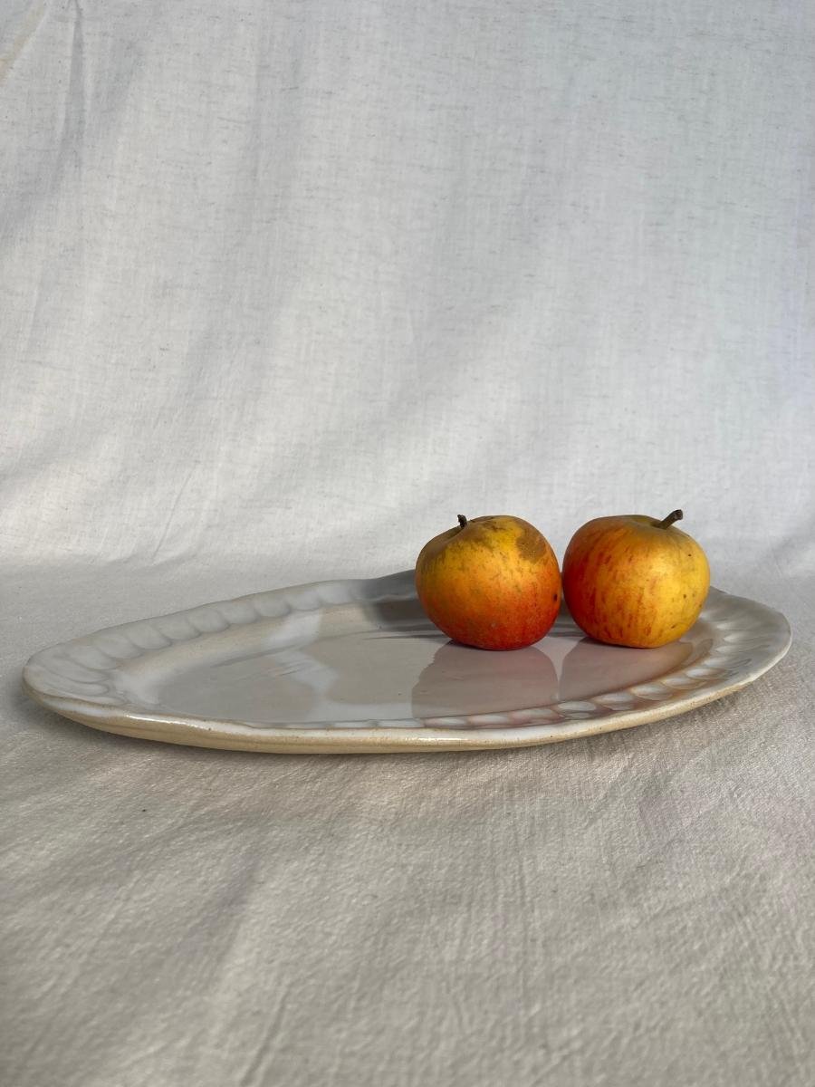 Plat en grès, fabriquée à la main avec la technique "de la plaque". Il a été émaillé en blanc brillant sur la surface intérieure. L’arrière de la pièce n’est pas émaillée.