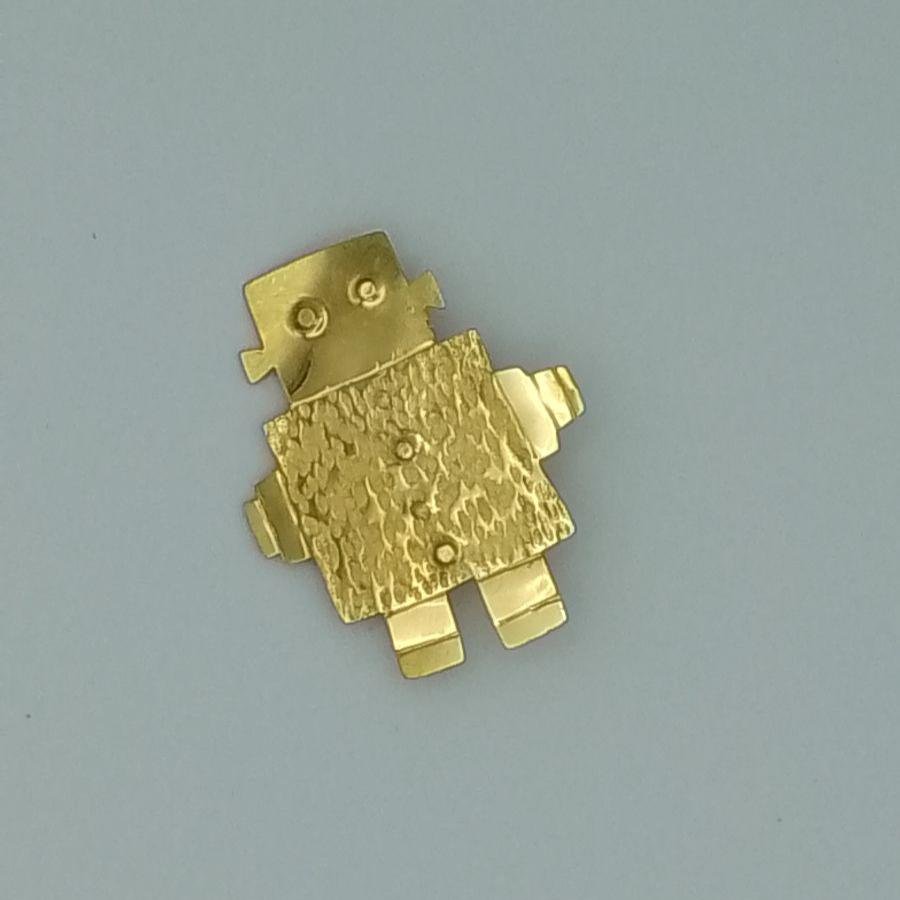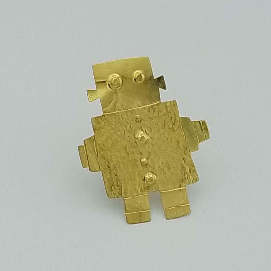 Ce gentil petit robot tendance et chic est une version pop du mythe du Golem , symbole de l’inanimé devenu animé . Cette broche contemporaine , singulière et précieuse est tant une invitation au conte qu’un petit compagnon.